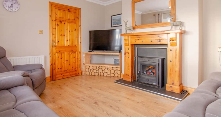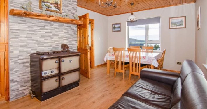 To the western side of the cottage there is a sunroom with spectacular sea views which acts as a second living area. This space features a log-burning stove and wood deck outside area. There is ample parking surrounding the cottage for up to 4 cars.